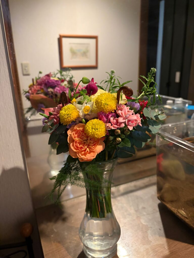 ところで、大4の娘は今日も1日パジャマ姿でした。昨日は友人たちに誕生祝いをしてもらい、とても素敵な花束をもらったので玄関に飾っていました。昔も今も友人に囲まれ、ありがたいことです。